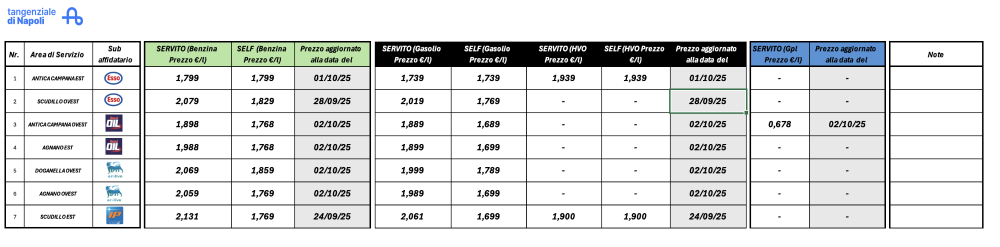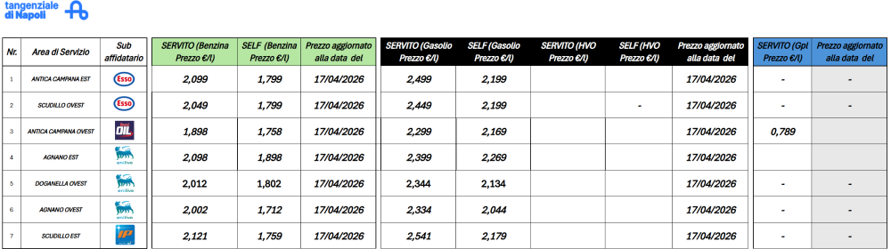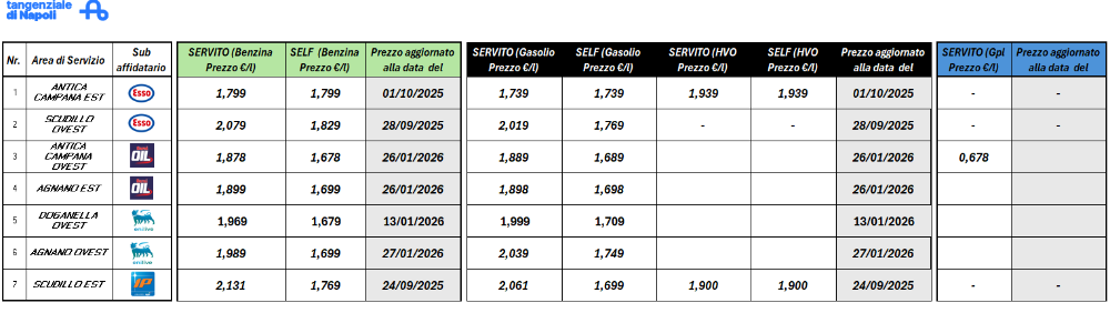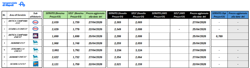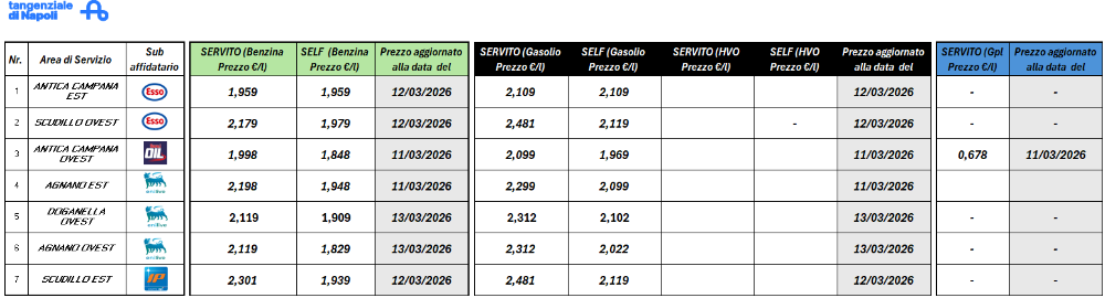 Sulla Tangenziale di Napoli sono in servizio n. 7 Aree di Servizio, così suddivise: