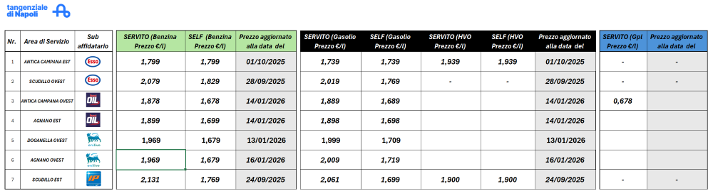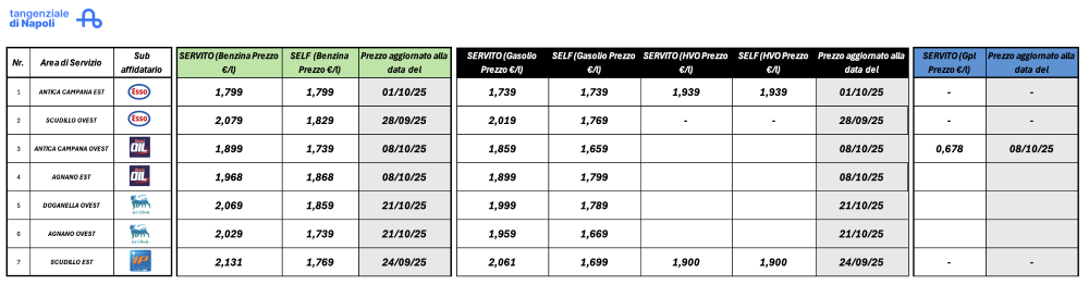 Sulla Tangenziale di Napoli sono in servizio n. 7 Aree di Servizio, così suddivise: