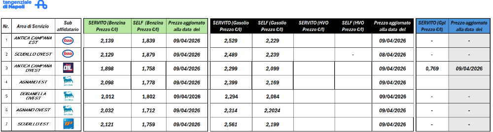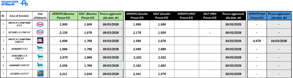 Sulla Tangenziale di Napoli sono in servizio n. 7 Aree di Servizio, così suddivise: